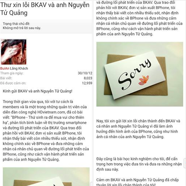 Ông cũng bày tỏ mong muốn những người yêu mến Bkav, Bphone cũng như những người yêu mến ông sẽ không “tấn công” người này. Một số ý kiến cho rằng trong trường hợp này, CEO Bkav vẫn nhẹ tay khi dễ dàng tha thứ cho các vu khống, bịa đặt đã gây thiệt hại về kinh tế, hình ảnh thương hiệu, uy tín cá nhân và uy tín thương hiệu chỉ sau “một lời xin lỗi”. Tuy nhiên có thể thấy, CEO Bkav kiên quyết bảo vệ thương hiệu. Theo ông Quảng, kể từ khi Bphone đầu tiên ra mắt vào năm 2015, cũng là thời điểm mạng xã hội bùng nổ, các phát ngôn trên môi trường này không được kiểm soát. Vì vậy, Luật An ninh mạng ra đời và có hiệu lực từ 1/1/2019 là công cụ để bảo vệ tổ chức, doanh nghiệp và cá nhân trên không gian mạng.