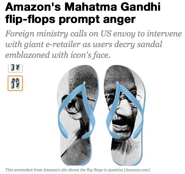 khổng lồ Amazon cũng ghi danh mình vào danh sách những những thương hiệu thiếu tôn trọng các giá trị văn hoá của một đất nước: mẫu dép in hình thánh Gandhi là một ví dụ như thế.