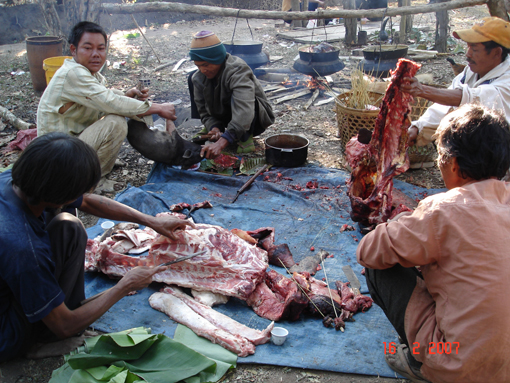 Mùa này heo rừng cũng đi hàng đàn vừa kiếm ăn vừa... du hí. Ấy là lúc dân làng tổ chức săn tập thể. Việc đầu tiên là già làng phán đoán hướng đi của đàn heo. Đây là công việc vô cùng quan trọng, quyết định thành bại của chuyến săn, hoàn toàn dựa vào kinh nghiệm sống của cá nhân già làng. Già làng sở dĩ được bầu là... già làng là bởi kinh nghiệm sống hơn người, biết ra những quyết định đúng đắn, chính xác để cả cộng động làng làm theo, kể cả những việc rất lớn như dời làng, dịch bệnh, cầu mưa, chiến tranh, chọn đất làng, đất rẫy... Thì khi đã đoán được hướng đi của đàn heo (nhiều đàn heo đến mấy trăm con, mấy thế hệ), công việc còn lại khá đơn giản, ấy là đào một cái hố vừa rộng vừa sâu, rồi rào đường đến cái hố ấy, sao cho khi đàn heo xuất hiện, chúng cứ men theo hàng rào ấy mà đi, và đến cuối hàng rào thì... lần lượt từng con rơi xuống hố. Tất nhiên lúc này có sự hỗ trợ của lửa, tiếng động, la hét và cả chó để cuộc săn kết thúc sớm. Hơi giống kiểu đặt nò sáo của ngư dân sông nước. Vậy mà hiệu quả. Cũng xin nói luôn là sau đó người ta chọn lọc chứ không giết hết, những con có chửa, những con còn nhỏ, được thả vào rừng, không như chúng ta bây giờ lớn bùi bé mềm, xơi tuốt. Thịt lợn săn được chia đều, tất cả răng nanh được tập trung treo lên nóc nhà rông như một cách khoe chiến tích đồng thời cũng là vật thiêng luôn. Hồi mới lên Tây Nguyên vào nhà rông làng Kon Rơ Bàng tôi đếm được 279 cặp răng nanh như thế, và bỏ nguyên một ngày nghe già làng kể chuyện cuộc săn khổng lồ ấy. Muối không có như bây giờ nên cách tích trữ thịt heo (và các loại thịt săn được, kể cả... chuột) của đồng bào khá đơn giản. Một là nhét vào ống nứa gác lên giàn bếp. Kiểu này thì trữ được cả... nước thịt. Khi ăn cầm ống lắc ra, có thể đổ vào nồi canh hoặc là chưng lên, thậm chí chả cần... nấu. Kiểu nữa là xâu thịt treo lên giàn bếp, để miết thì nó ám khói khô đi. Kiểu này ăn ngon phết. Bây giờ về Krông Pa nhiều nhà người Kinh cũng bắt chước làm kiểu này bằng thịt bò, chấm muối kiến ăn rất ngon, đặc biệt làm mồi nhậu thì thôi rồi. Thịt để cả tảng, bên ngoài nhìn đen sì sì, xé ra từng sợi thịt còn đỏ hồng, mềm, ngọt, vào đến đâu biết đến đấy. Món này làm ngon nhất là thịt nai. Ngày xưa về các làng đồng bào, bao giờ cũng được bà con trịnh trọng lôi ống nứa xuống, đổ ra một ít thịt ấy, mời khách. Khách thì luôn thủ sẵn bột ngọt, tiêu, muối, cho thêm vào rồi nấu lên, trợn trạo ăn sau khi đã uống rượu cần cho đến hết ngửi thấy mùi gì?